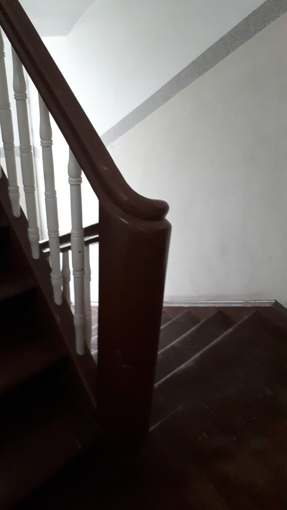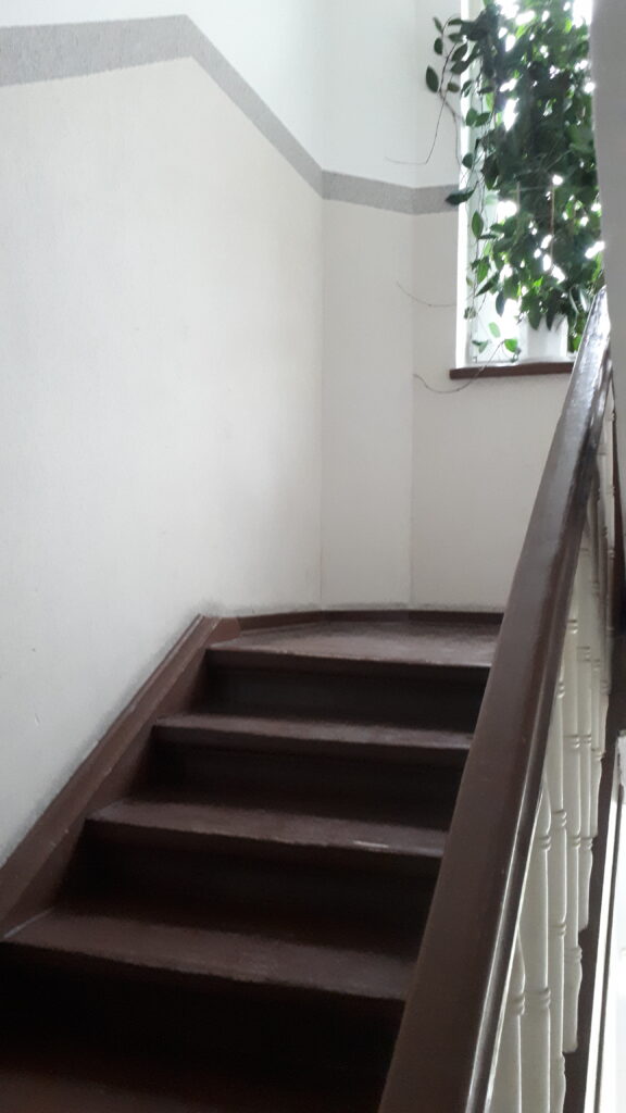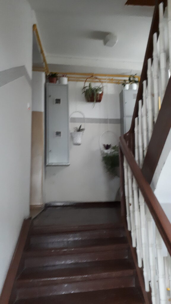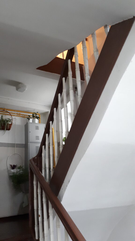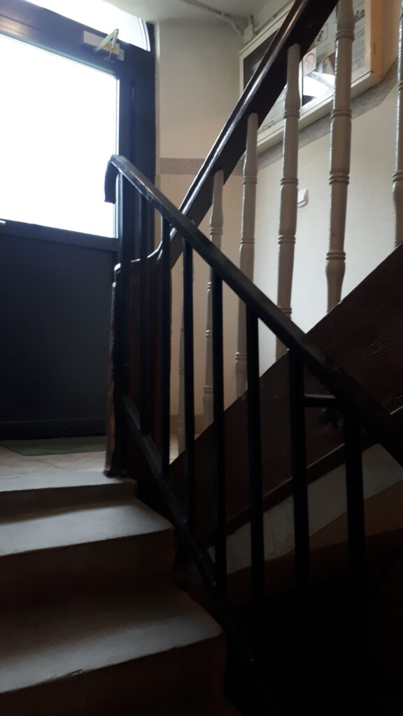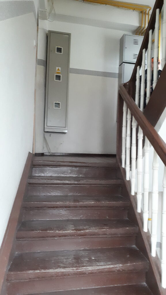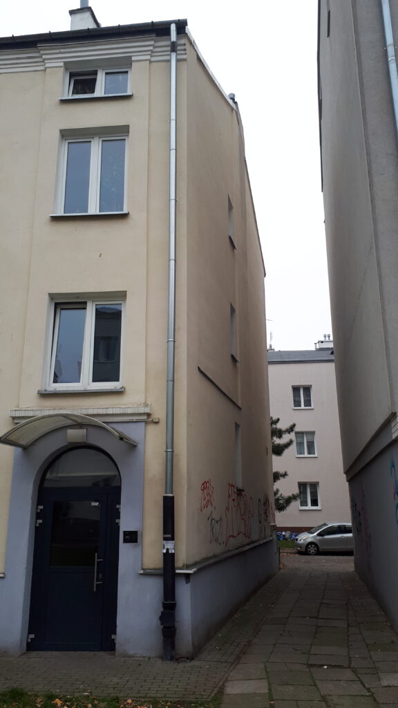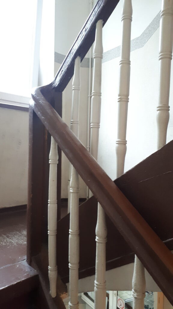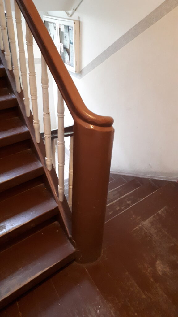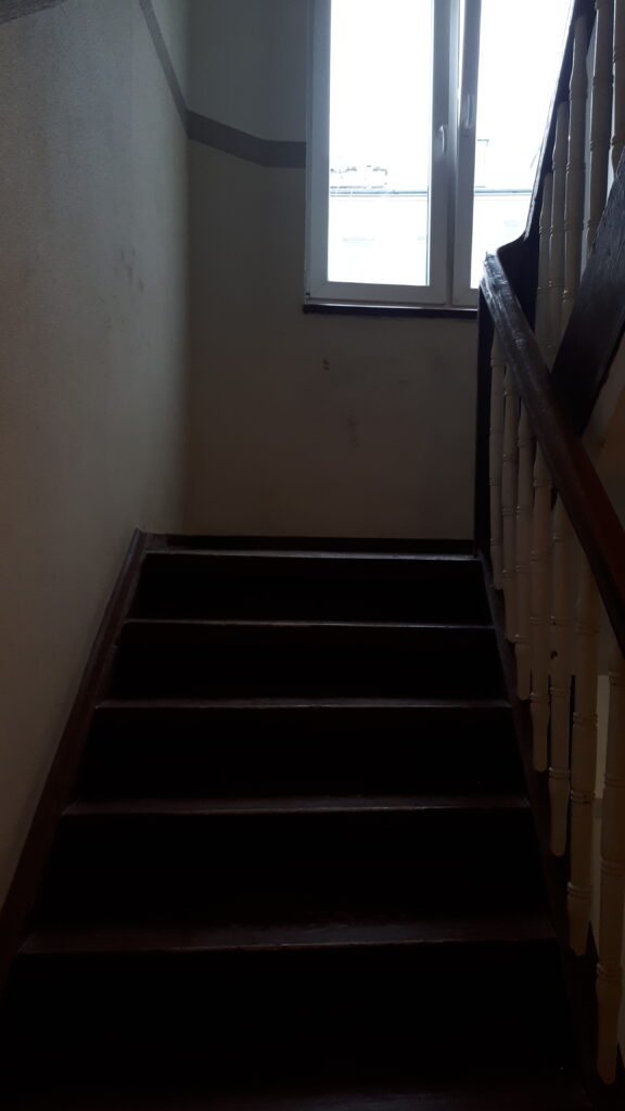 Swoje „robotnicze” przeznaczenie budynek potwierdza też wewnątrz. Zarówno schody, jak i podesty są drewniane, mimo, że posadowione na stropach Kleina, były wówczas raczej synonimem obiektów mniej ekskluzywnych. Na piętrach są po trzy mieszkania i pomieszczenie wspólnej toalety – dziś zapewne adaptowanej na schowek/komórkę.